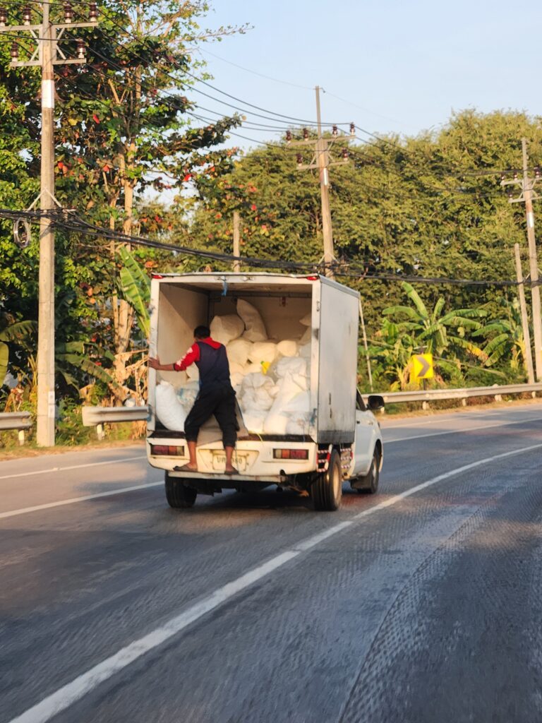 We got up really early and drove 3 and a half hours North, off of the island of Phuket and back on the mainland. The drive was actually really pleasant – very little traffic on the country roads on a Sunday morning. We passed through coconut farms on both sides of the road, huge bougenvilla all in bloom, and mountainous scenery. The only other vehicles on the road were pickups loaded with produce, some even with a guy hanging out on the back bumper.