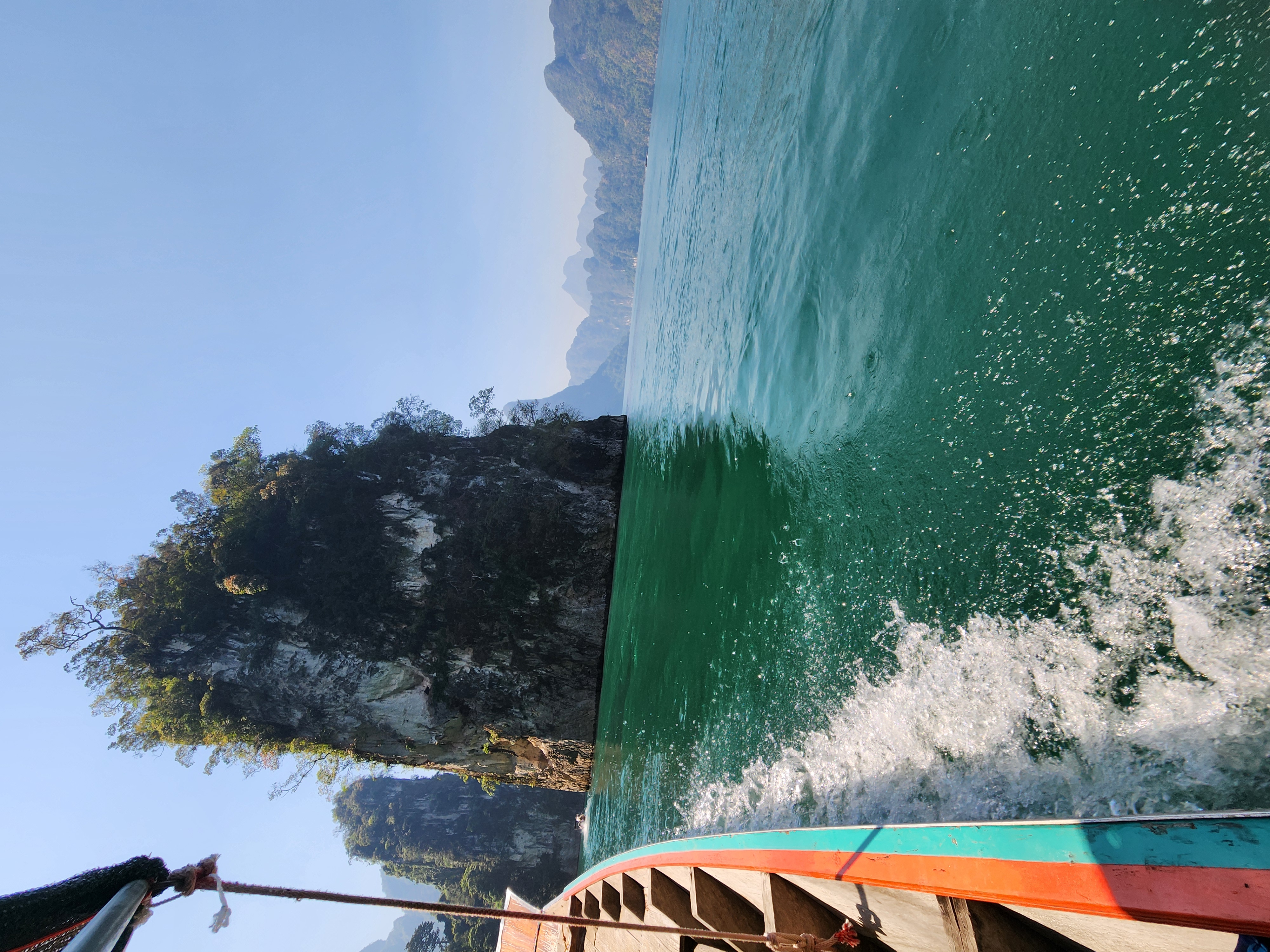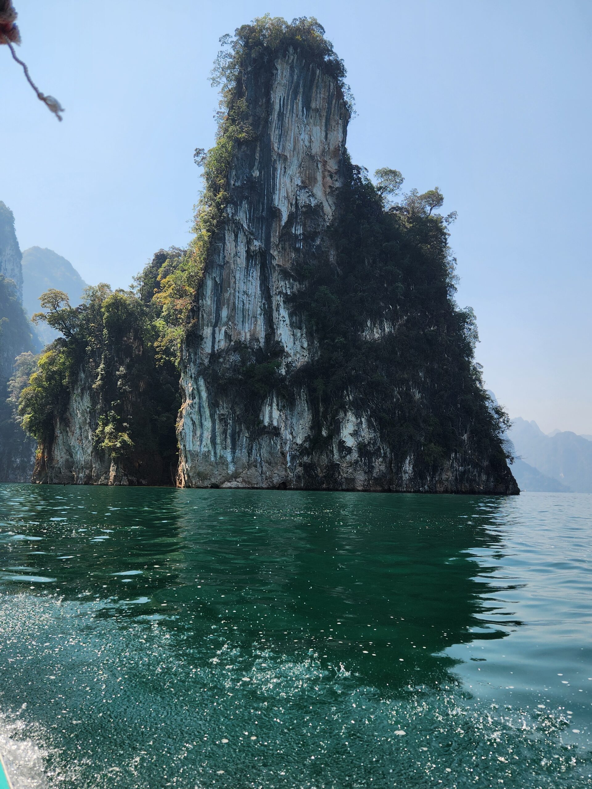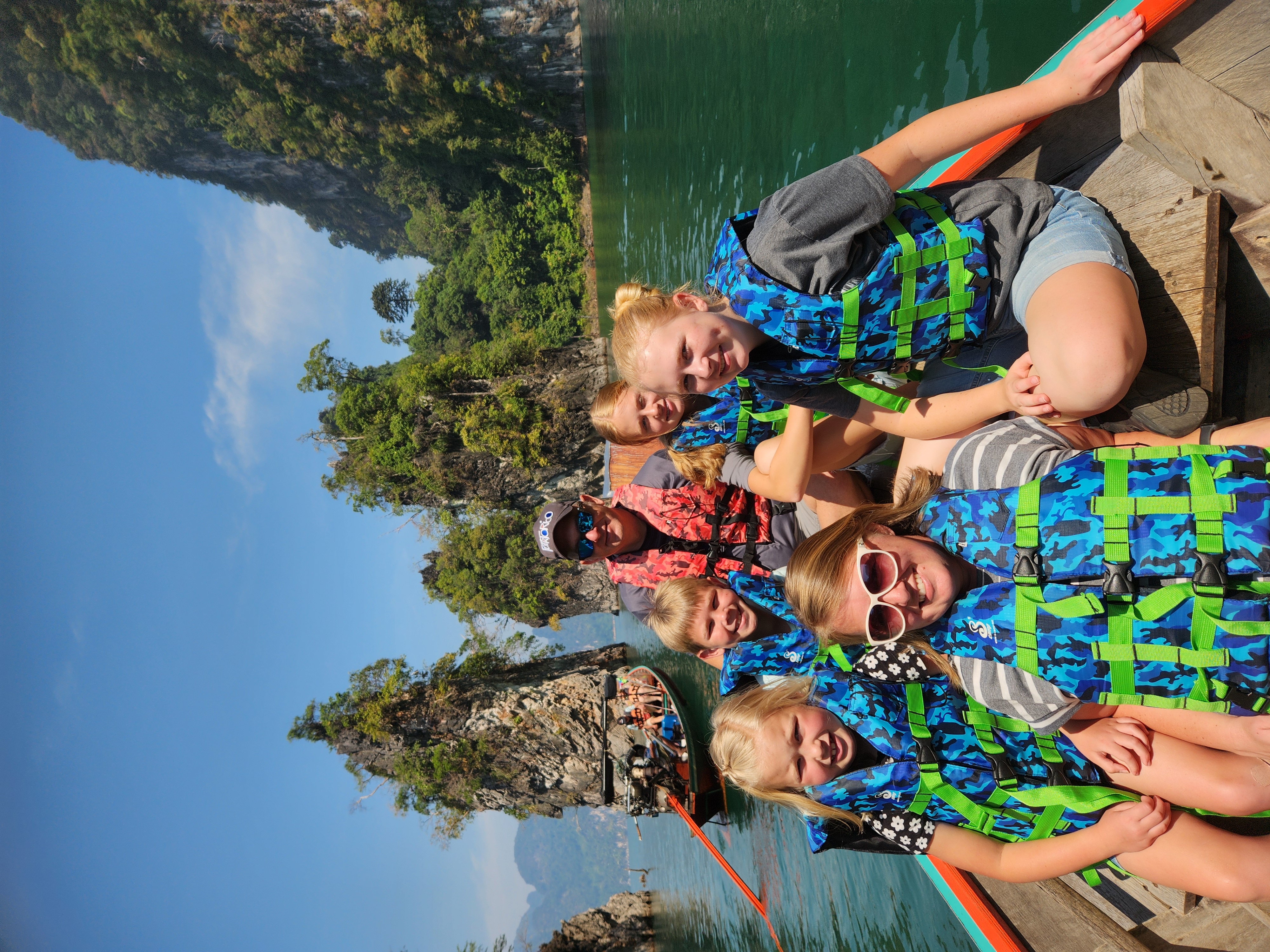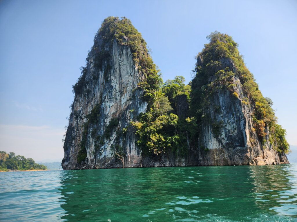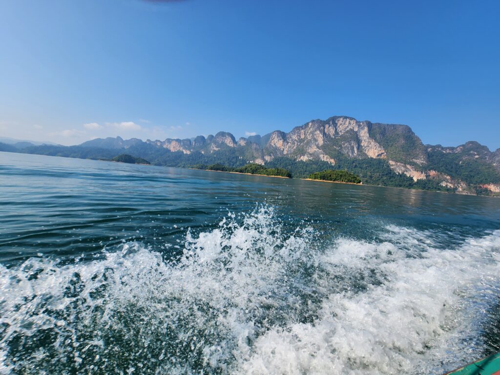 We took off across the lake and enjoyed the gorgeous turquoise water and rocky outcroppings covered in jungle trees for about an hour. The farther we went across the lake and between the mountains, the more amazing the scenery became. We navigated to one of the most famous rock formations on the lake – three giant boulders sticking up out of the water in a row. The Thai name for this place means “Three Friends” according to Iris. We got to take turns taking pictures (or as our guide says when having us pose “Make a picture”) up on the front of the boat.