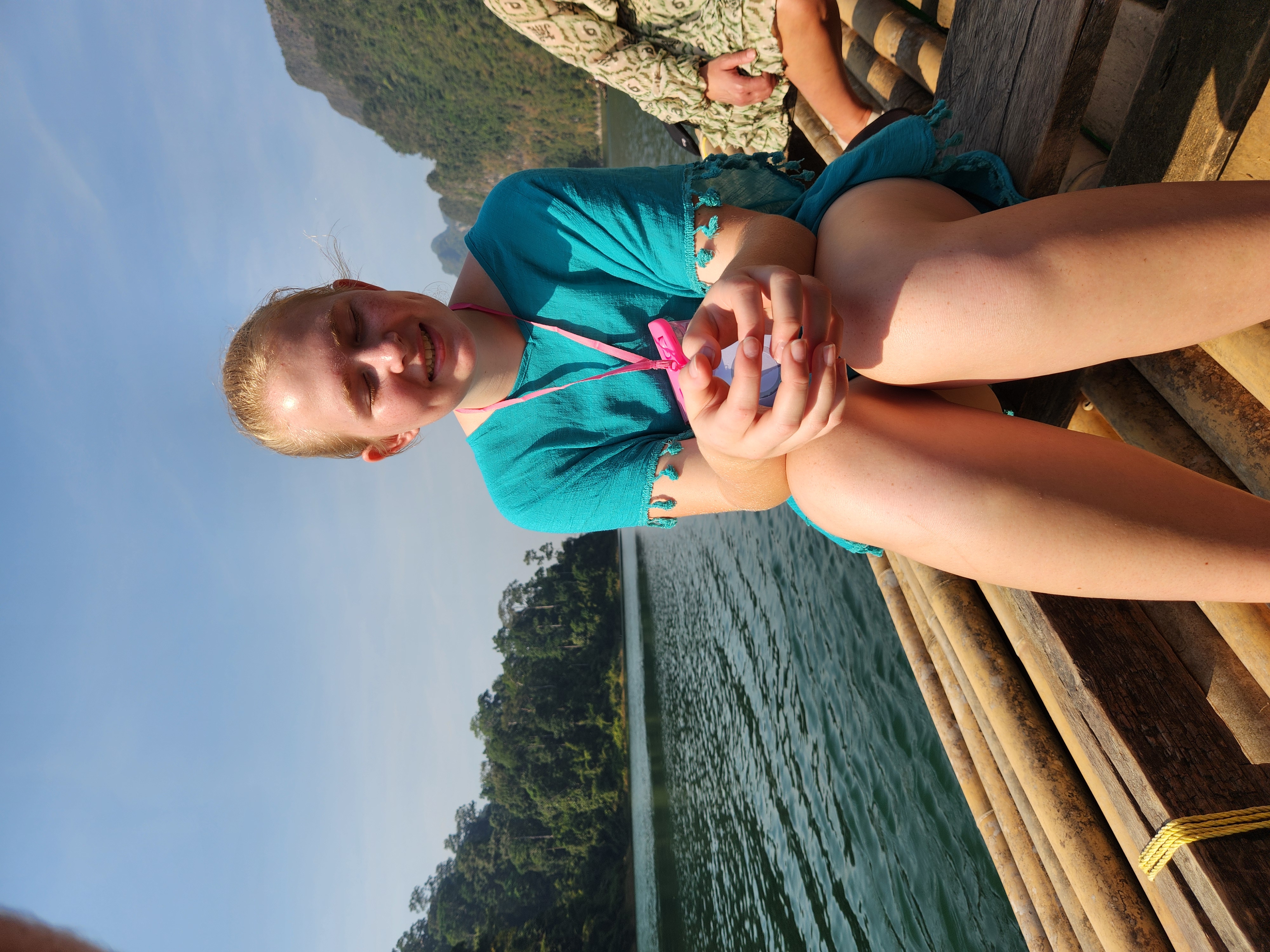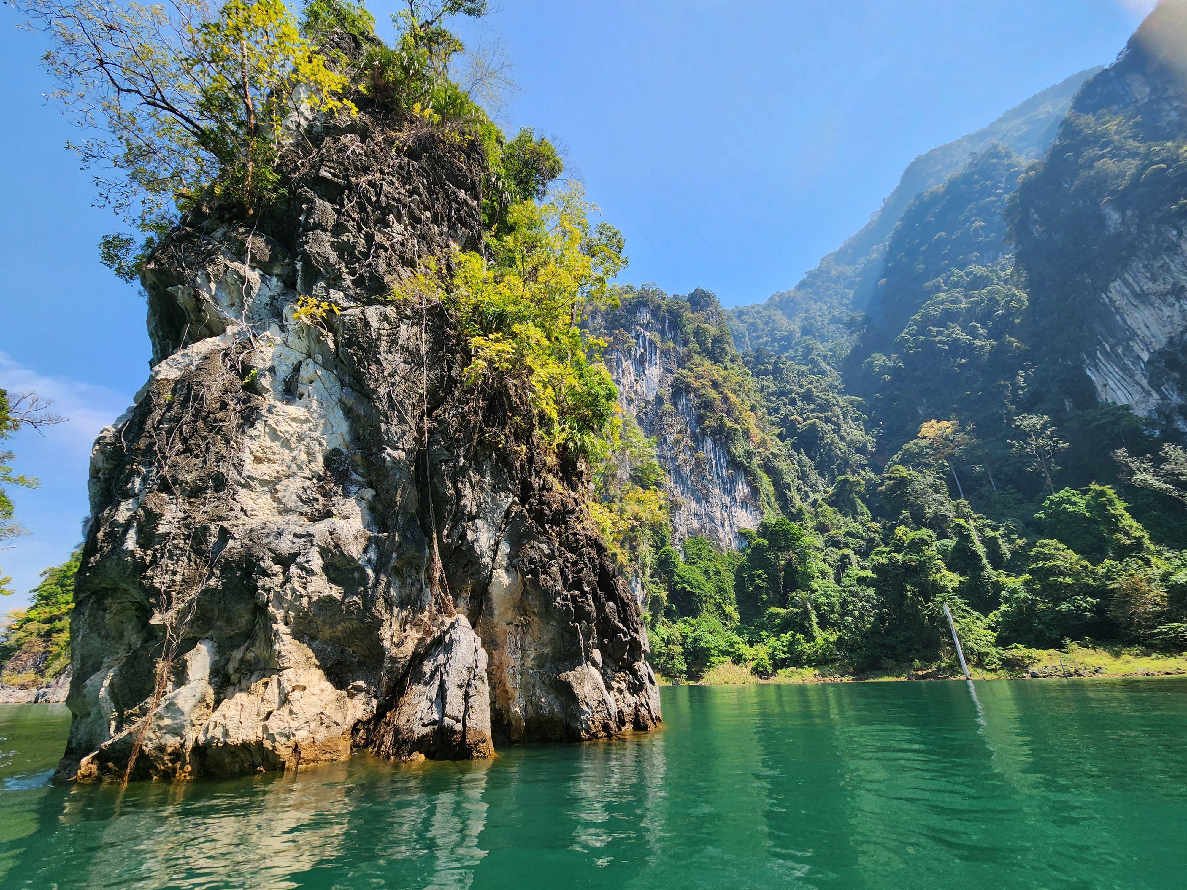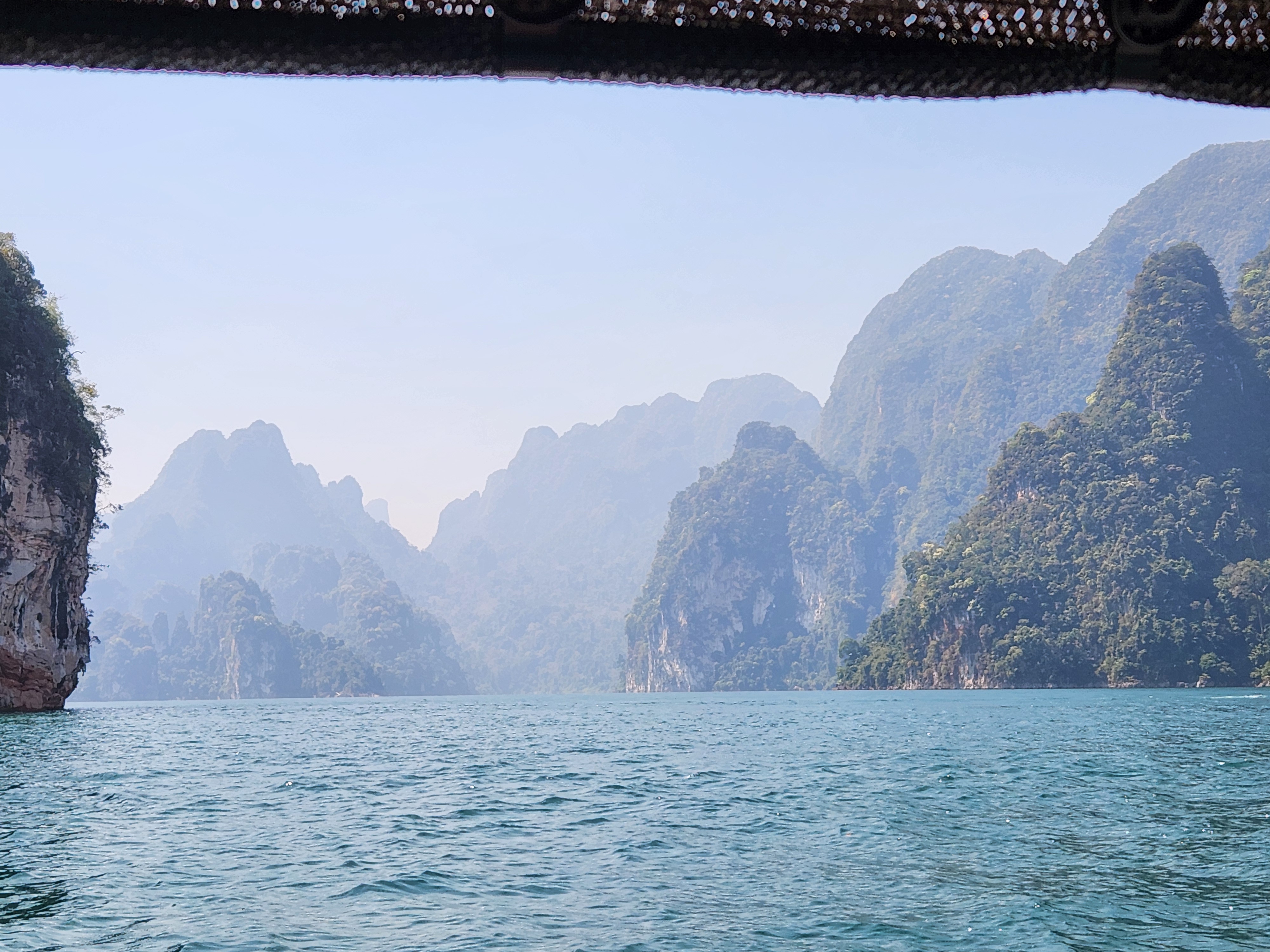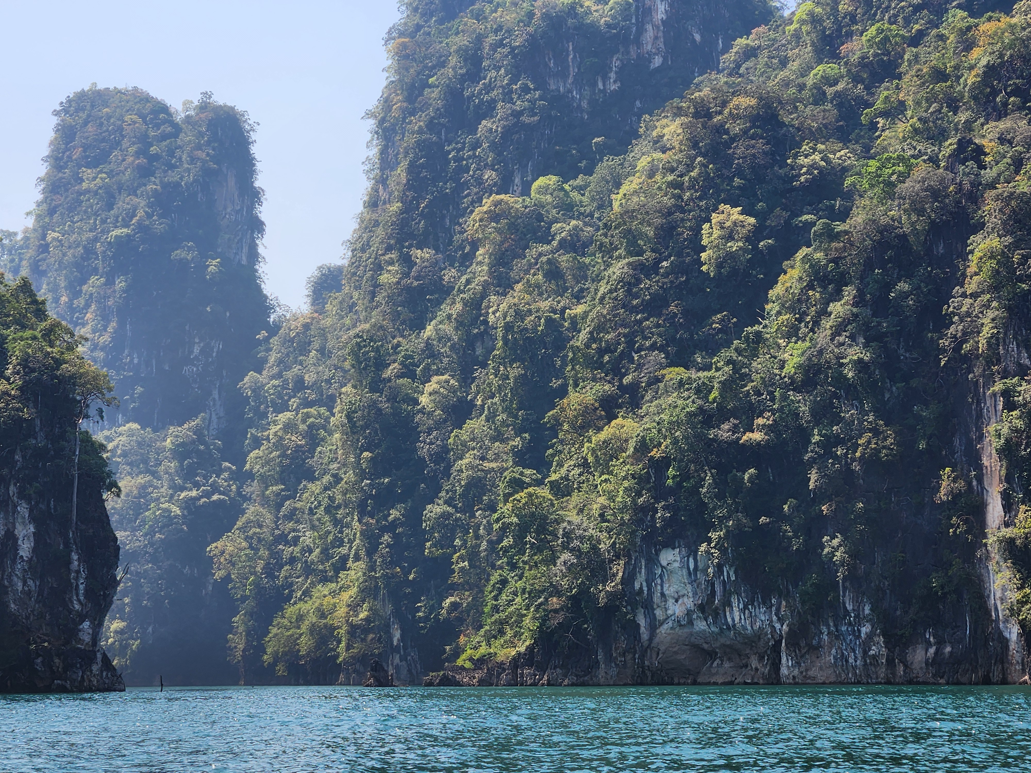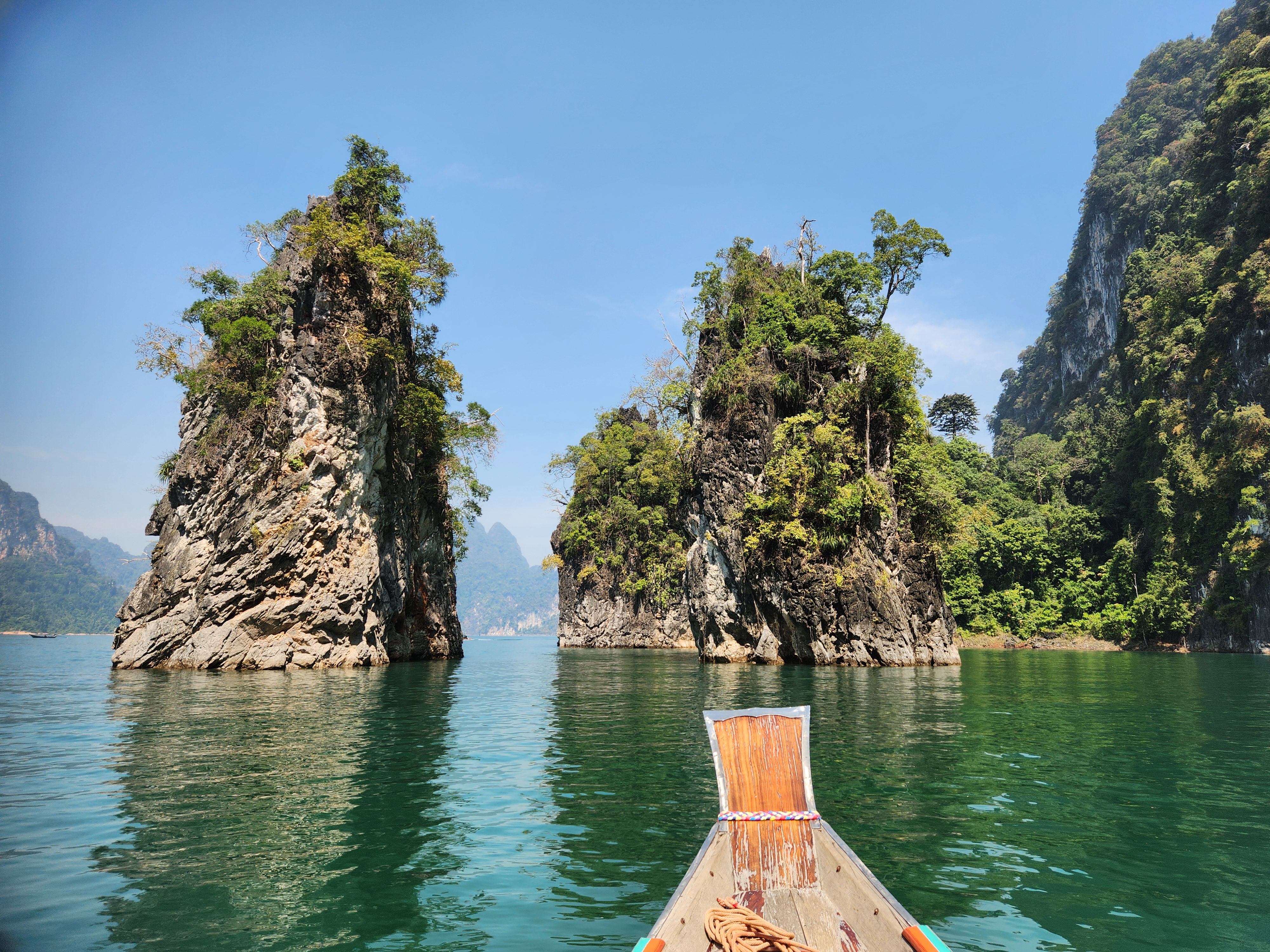 We took off across the lake and enjoyed the gorgeous turquoise water and rocky outcroppings covered in jungle trees for about an hour. The farther we went across the lake and between the mountains, the more amazing the scenery became. We navigated to one of the most famous rock formations on the lake – three giant boulders sticking up out of the water in a row. The Thai name for this place means “Three Friends” according to Iris. We got to take turns taking pictures (or as our guide says when having us pose “Make a picture”) up on the front of the boat.