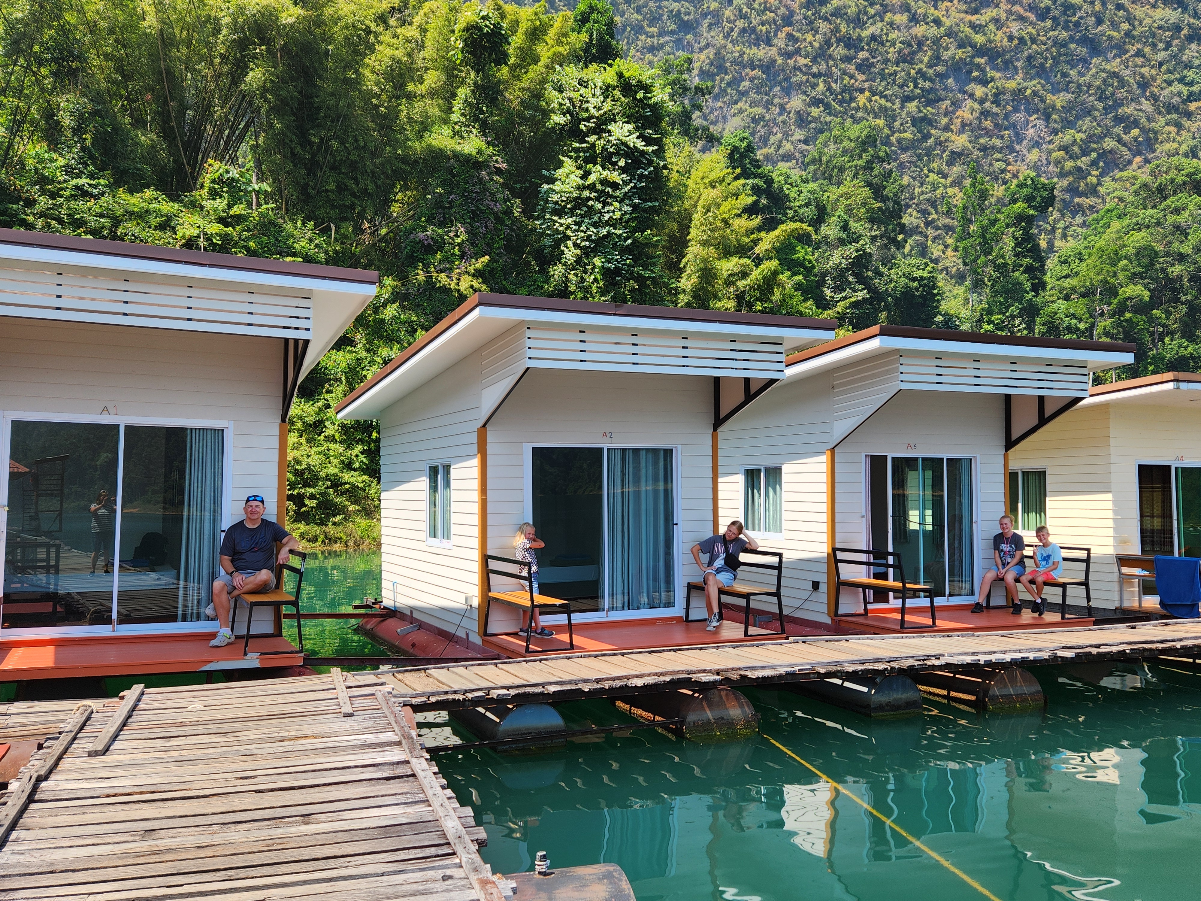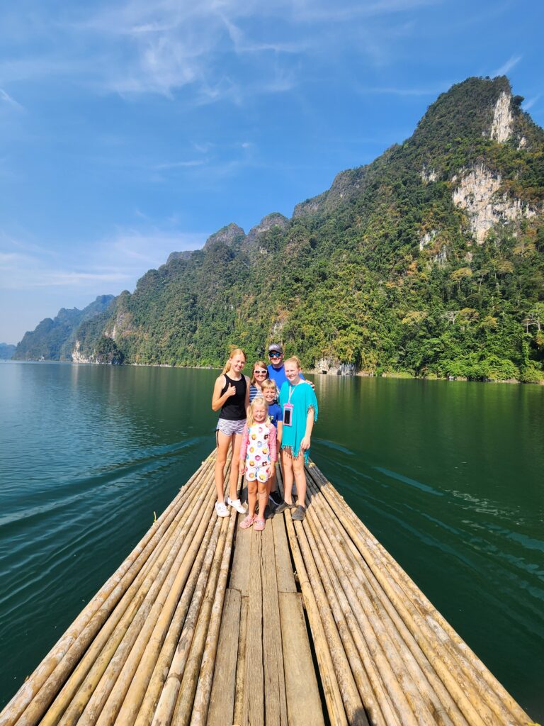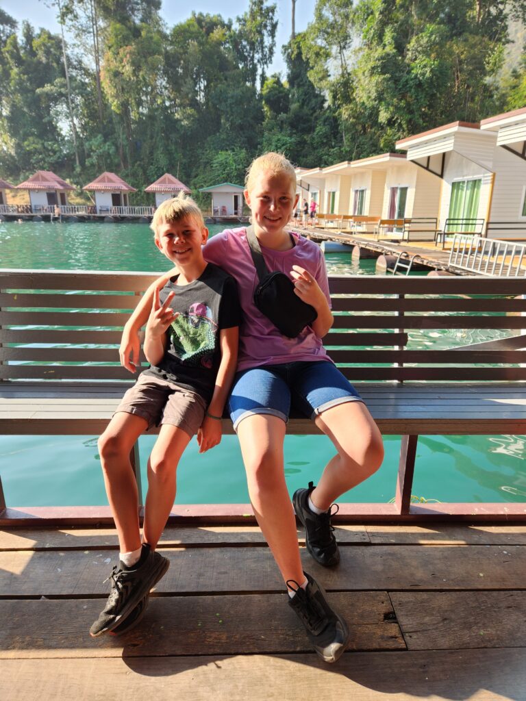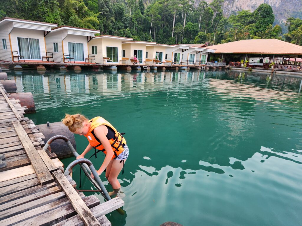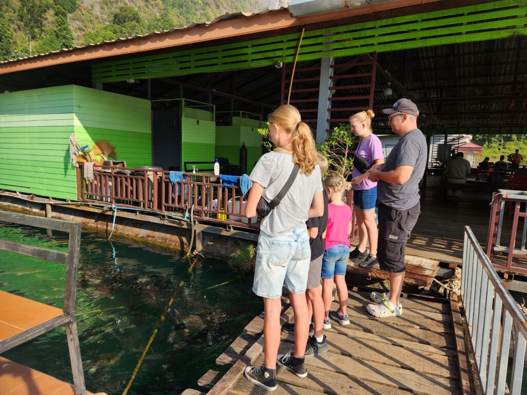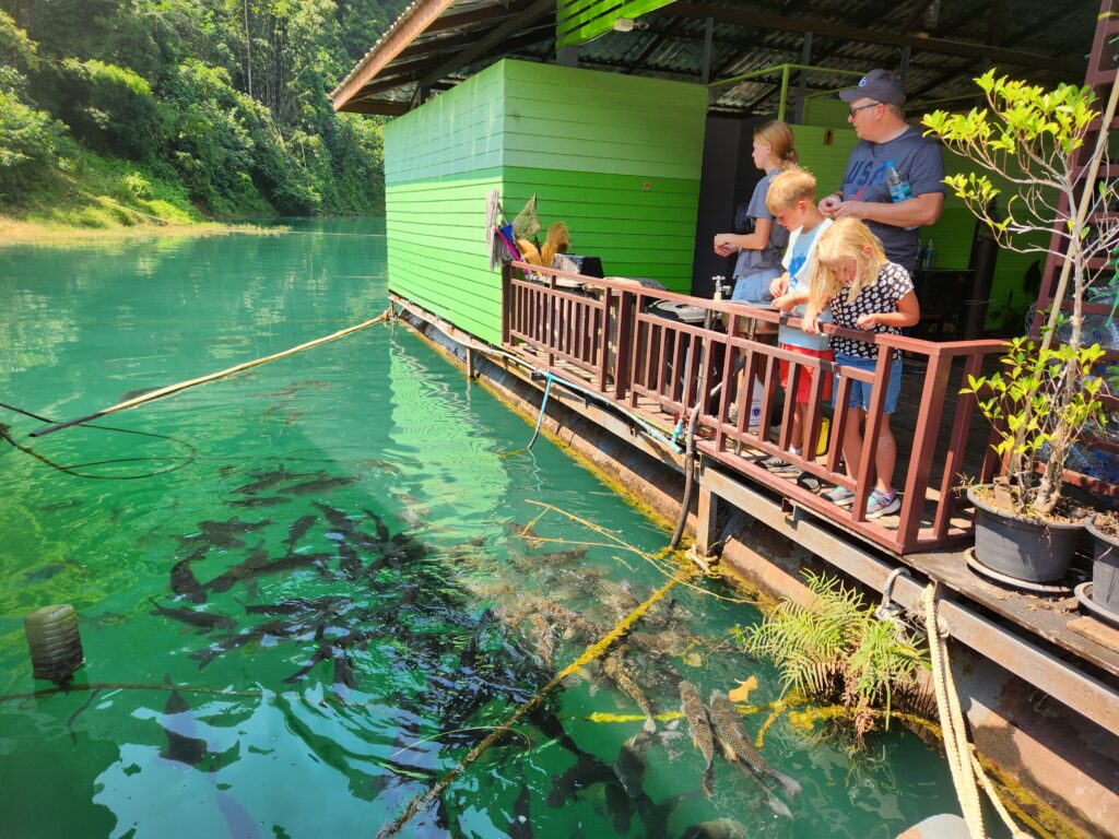 We stopped here to check in and have lunch. The rooms are attached (or nearly attached, haha) to a floating dock. They have a tiny front porch, sliding glass doors that only lock from the outside, and are just room enough for a queen-size bed (rock hard mattresses like all of Thailand). We lucked out because our rooms included a tiny bathroom – half of the bungalows had a shared bathroom in the middle of the row instead. The bathrooms included a toilet, tiny sink, and a shower head (don’t forget to put the toilet paper outside of the bathroom before you shower) with a drain in the floor. The kids were positive that the drains just went down into the lake…. Iris assured us that all the wastewater is collected in a big septic tank. We have three bungalows in a row for the six of us, so the teen girls each paired with one of the little kids to share, and Superman and I took the one on the end with the sketchiest gap to cross. The kids said this is the most rustic place they’ve ever stayed… I said “Emphasis on the rust!”