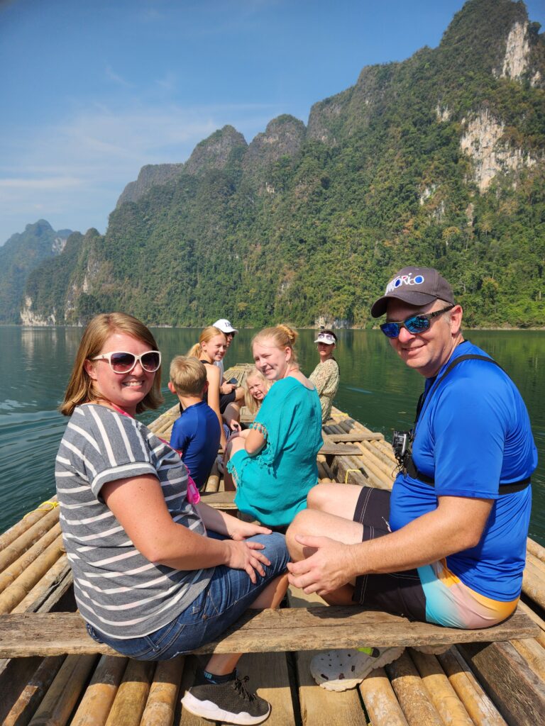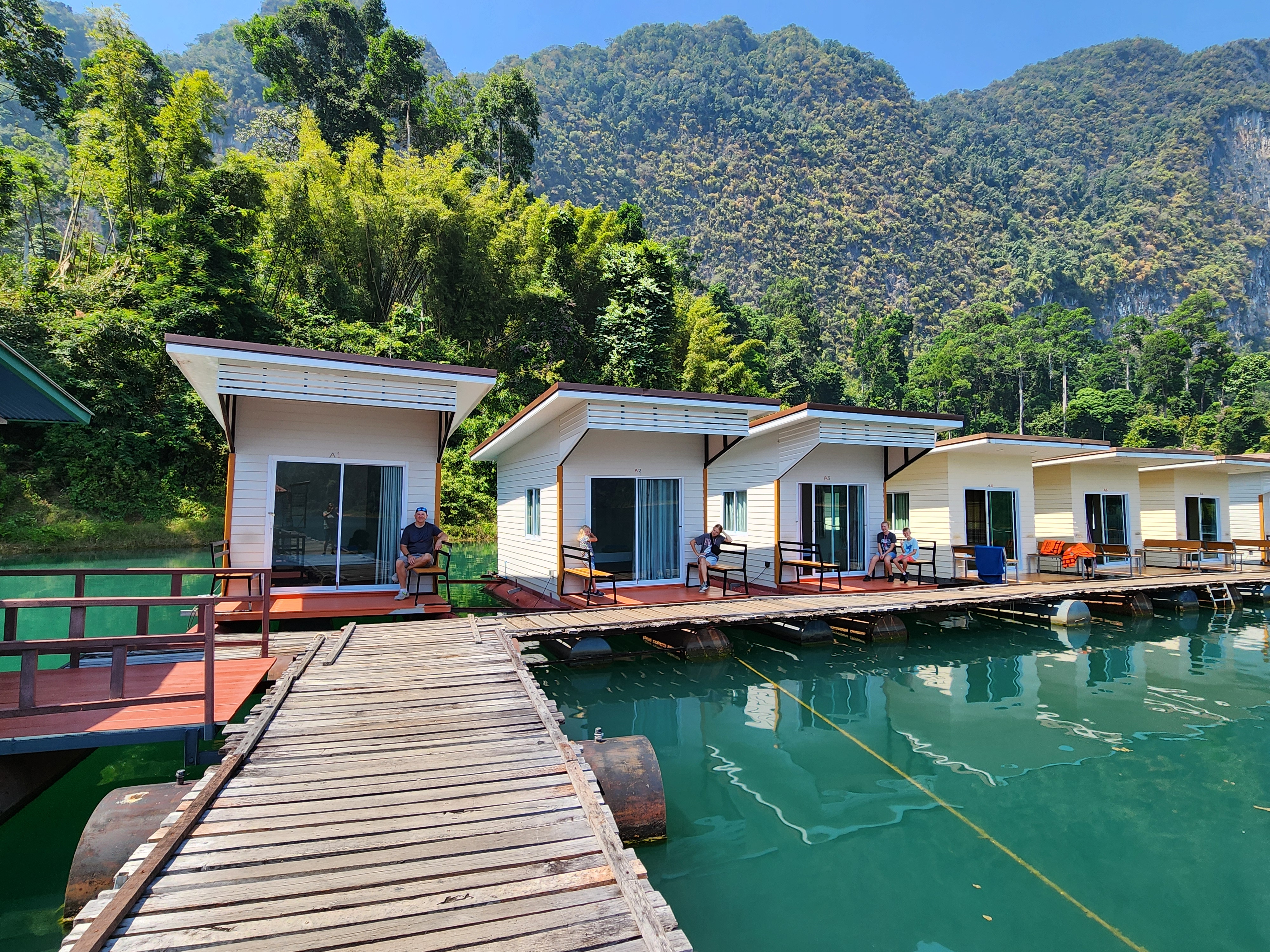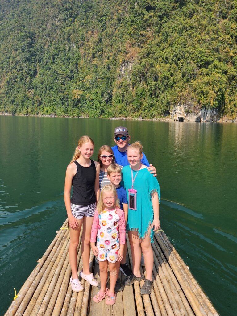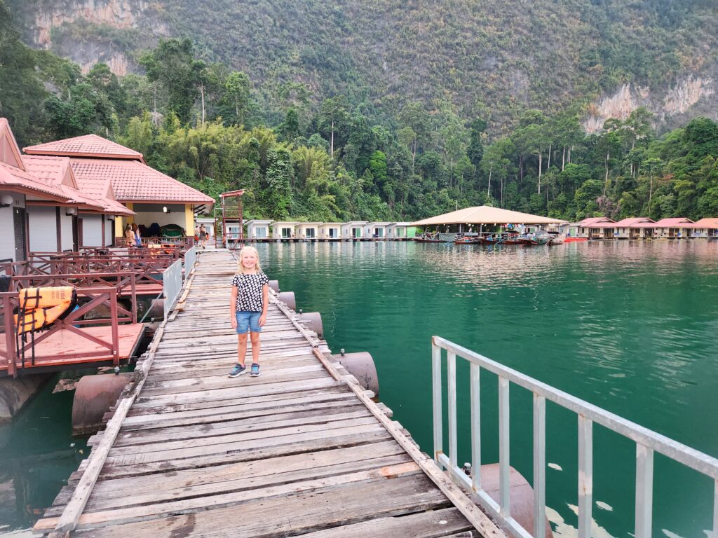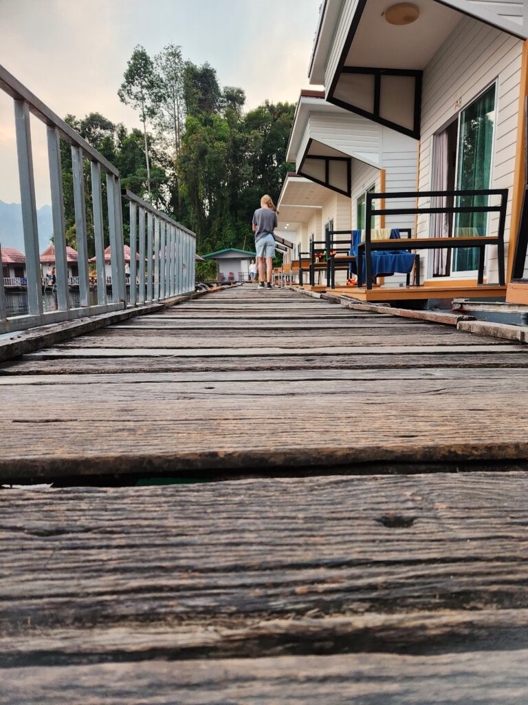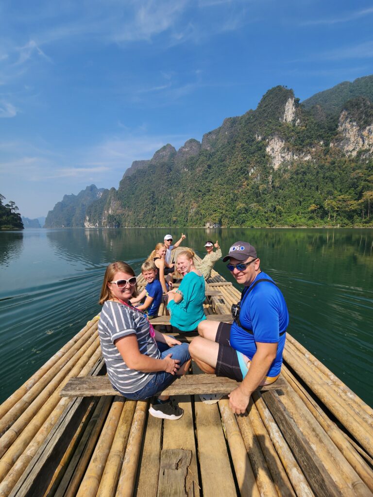 We stopped here to check in and have lunch. The rooms are attached (or nearly attached, haha) to a floating dock. They have a tiny front porch, sliding glass doors that only lock from the outside, and are just room enough for a queen-size bed (rock hard mattresses like all of Thailand). We lucked out because our rooms included a tiny bathroom – half of the bungalows had a shared bathroom in the middle of the row instead. The bathrooms included a toilet, tiny sink, and a shower head (don’t forget to put the toilet paper outside of the bathroom before you shower) with a drain in the floor. The kids were positive that the drains just went down into the lake…. Iris assured us that all the wastewater is collected in a big septic tank. We have three bungalows in a row for the six of us, so the teen girls each paired with one of the little kids to share, and Superman and I took the one on the end with the sketchiest gap to cross. The kids said this is the most rustic place they’ve ever stayed… I said “Emphasis on the rust!”