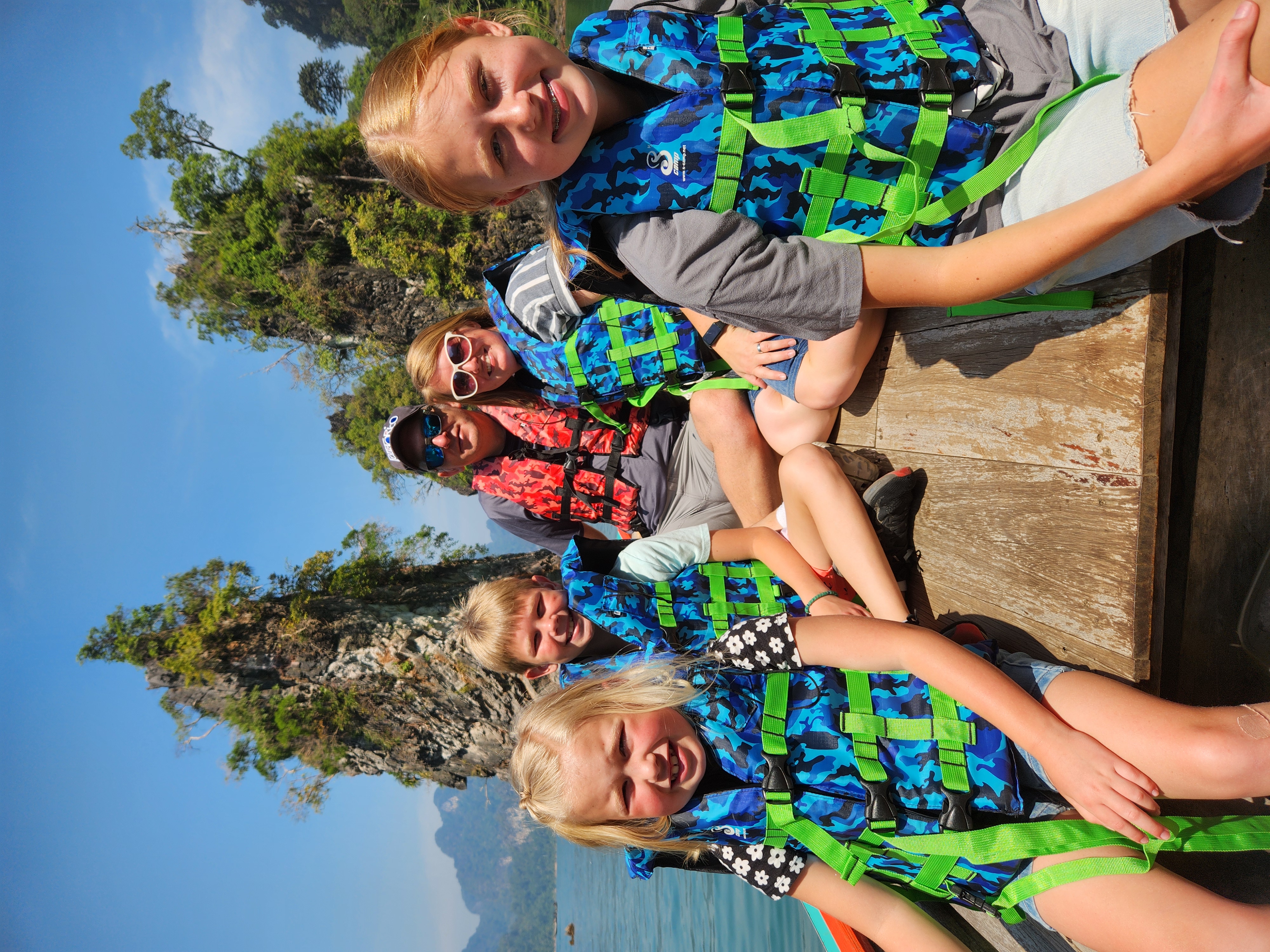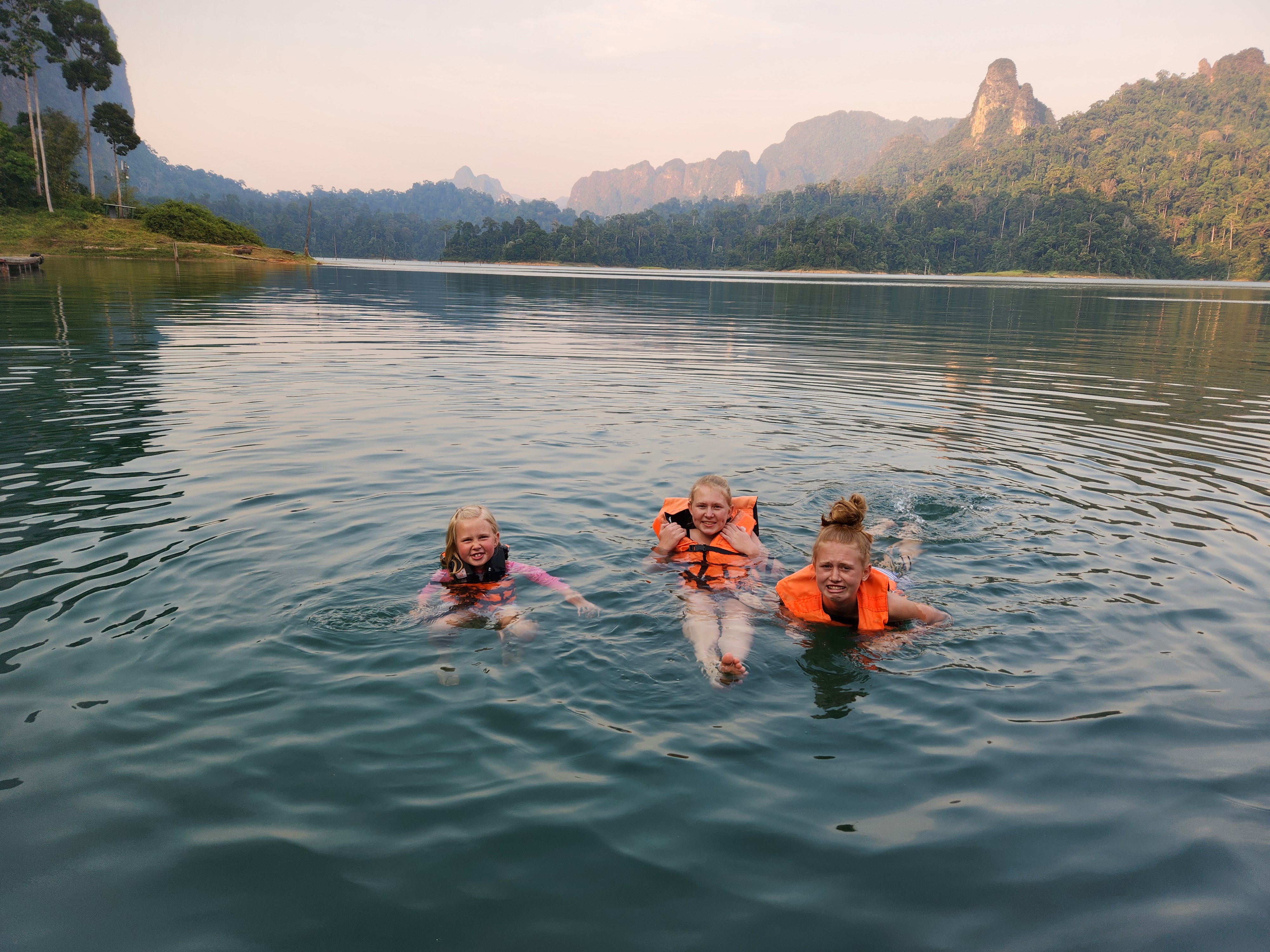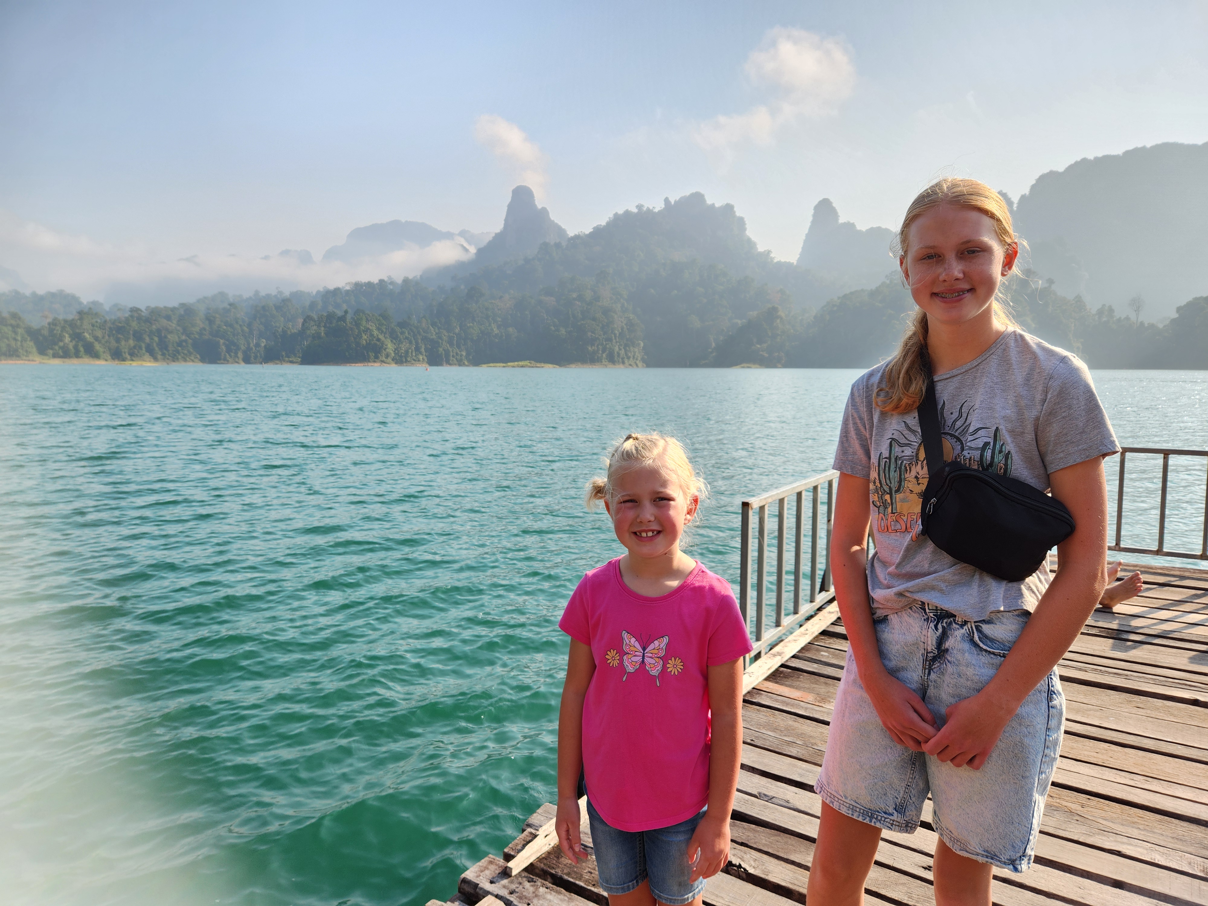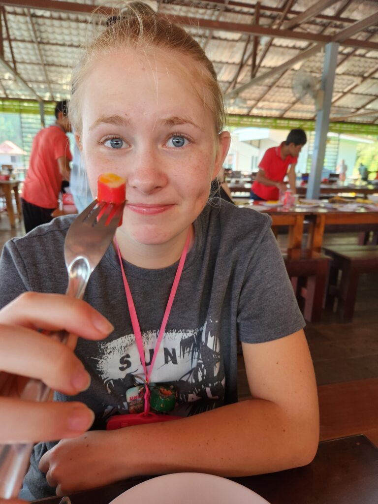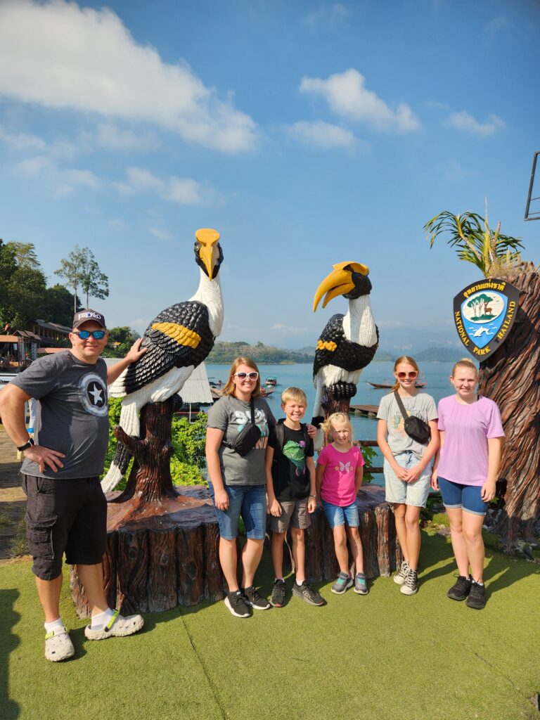 We stopped here to check in and have lunch. The rooms are attached (or nearly attached, haha) to a floating dock. They have a tiny front porch, sliding glass doors that only lock from the outside, and are just room enough for a queen-size bed (rock hard mattresses like all of Thailand). We lucked out because our rooms included a tiny bathroom – half of the bungalows had a shared bathroom in the middle of the row instead. The bathrooms included a toilet, tiny sink, and a shower head (don’t forget to put the toilet paper outside of the bathroom before you shower) with a drain in the floor. The kids were positive that the drains just went down into the lake…. Iris assured us that all the wastewater is collected in a big septic tank. We have three bungalows in a row for the six of us, so the teen girls each paired with one of the little kids to share, and Superman and I took the one on the end with the sketchiest gap to cross. The kids said this is the most rustic place they’ve ever stayed… I said “Emphasis on the rust!”