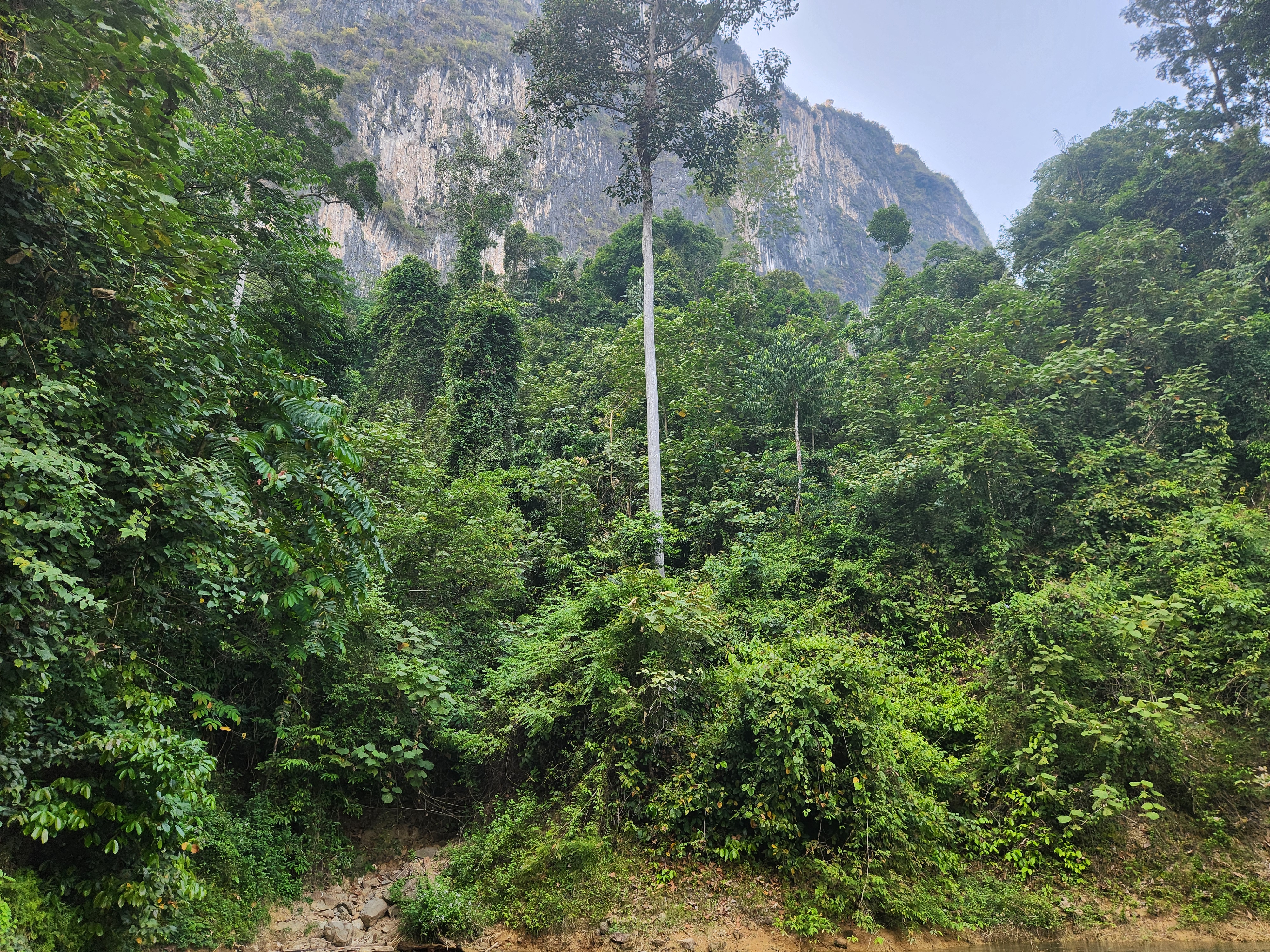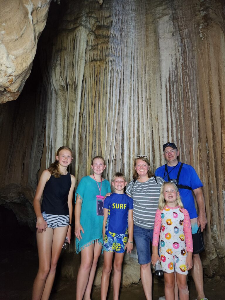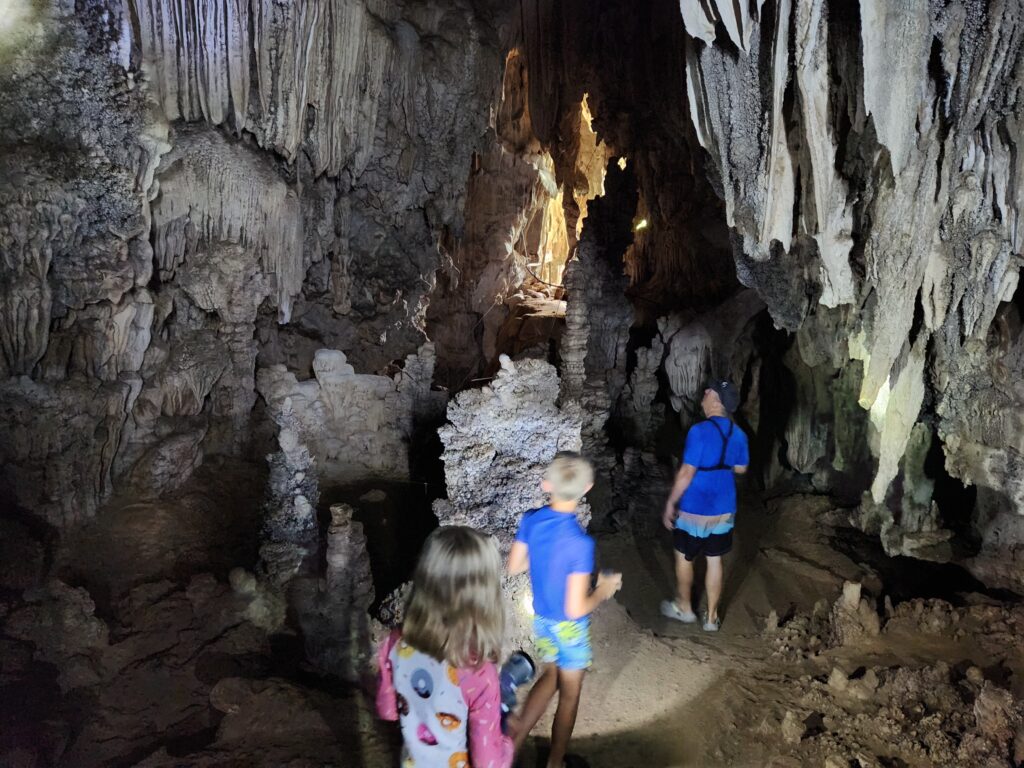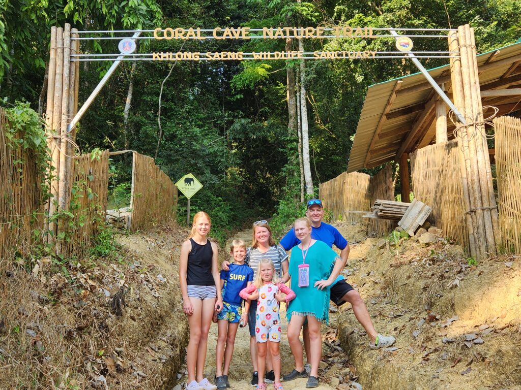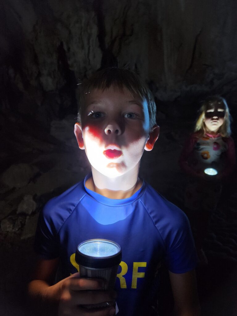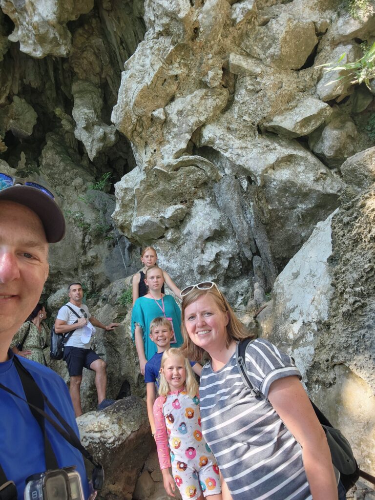 Then we got in the longtail boat again and crossed the lake to the Coral Cave trailhead. The hike is 2.5 km each way and has some steep sections, but overall a fairly easy hike. As we started up the trail Iris was pointing out different trees and plants. Then he said “My eyes 54. Spud, you keep eyes up, see bird and monkey.” Spud loved being put in charge of spotting animals in the trees overhead!