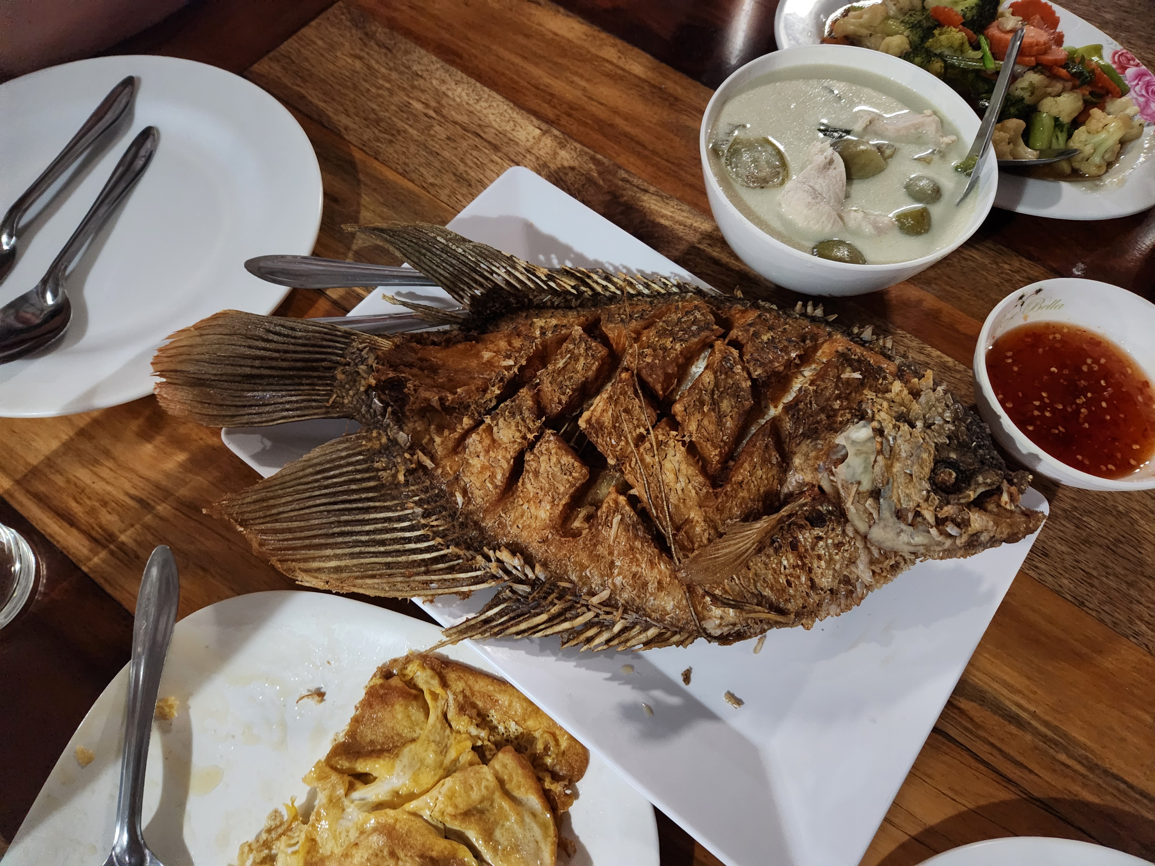 We all showered off the lake water and then had another Thai meal – this time we were served an entire fish (actually pretty good despite looking like an ugly monster). Thai omelettes are a dinner food eaten over rice of course. They aren’t bad, just oily and pretty bland. The favorite, as always, is the fresh pineapple and watermelon for dessert!