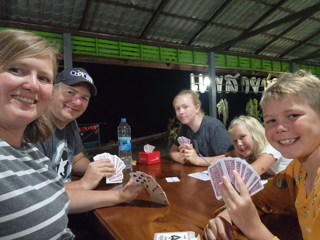 After dinner we enjoyed the sounds of the jungle quieting down for the night, watching geckos on the walls, and playing cards (Miss A was tired and went to bed early).