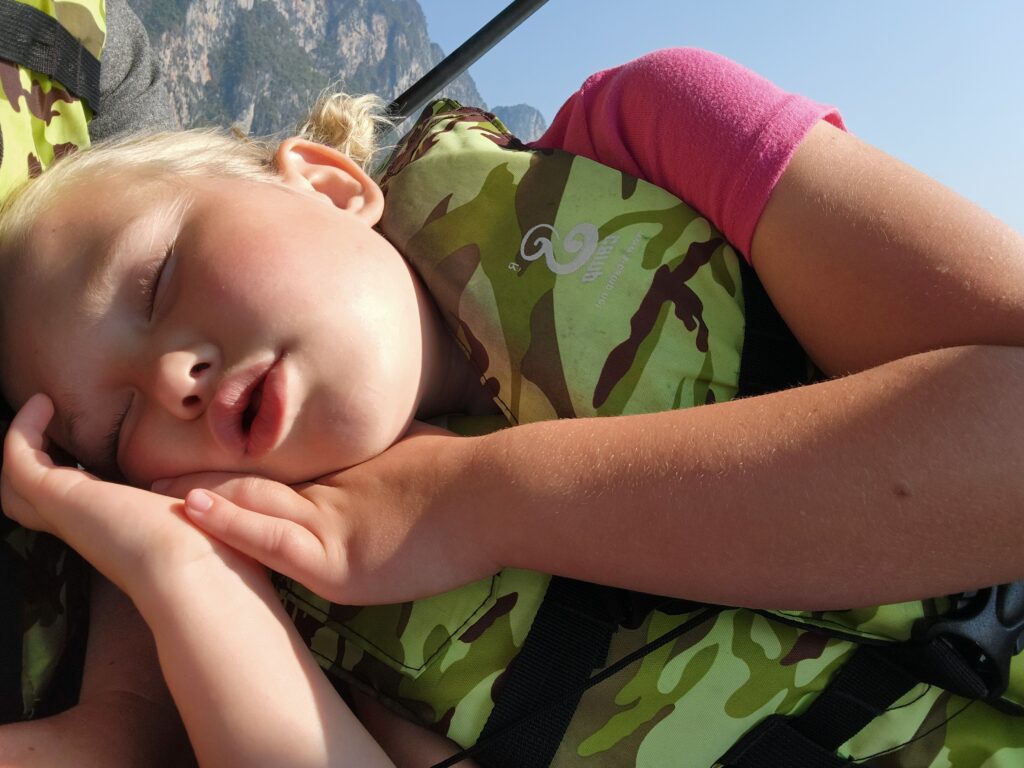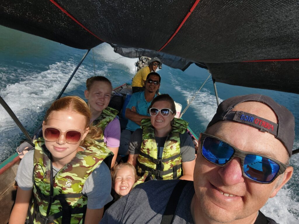 The ride back to the marina was beautiful and like traveling back to Earth from another planet. Littlest Girl fell sound asleep! Iris made our picture again by the great hornbill sign and then we gave him a tip ($200 baht) for being so great. Then he was off to drive 2 hours, pick up another couple, drive 2 hours back and do a romantic sunset tour. He said he’d get home about midnight and then tomorrow is his day off.